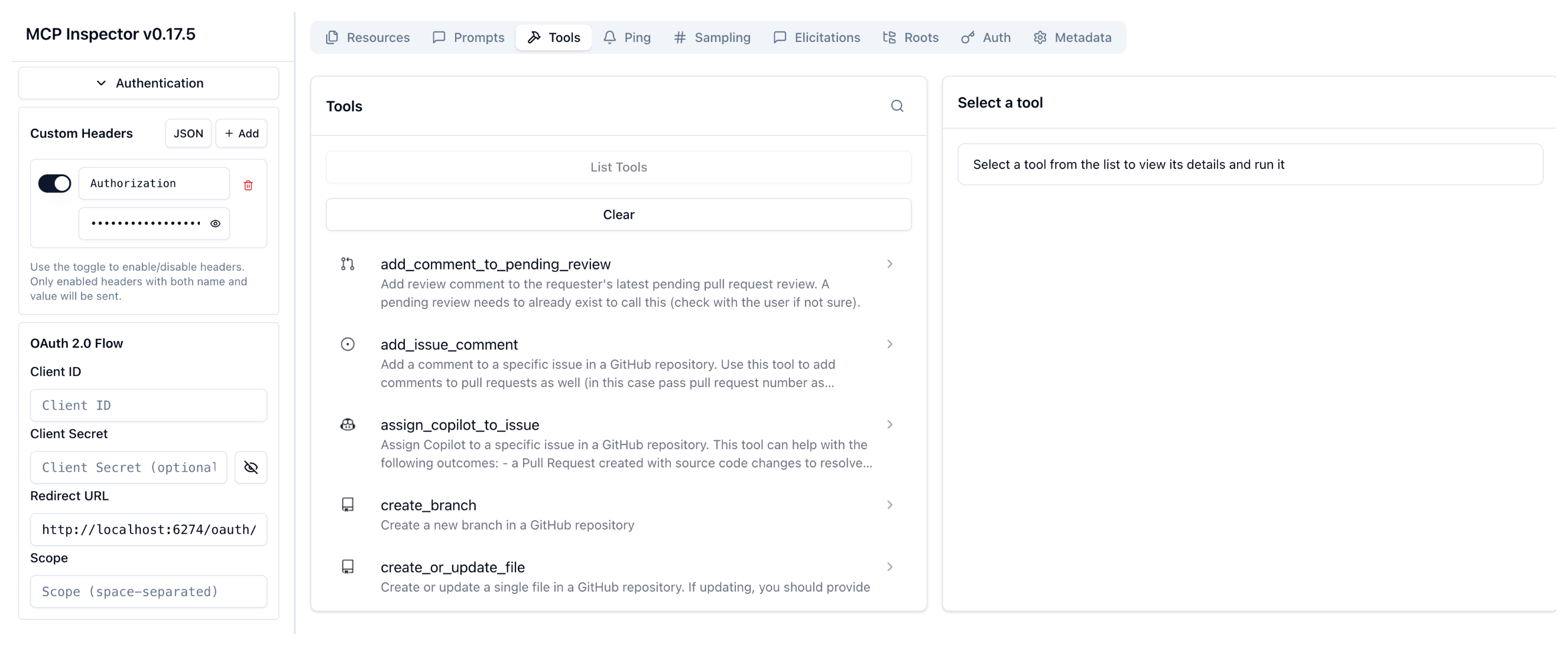 2. Go back to the MCP inspector tool. In the Authentication > Custom Headers card enter the JWT token for Bob. Then, click Re-connect.