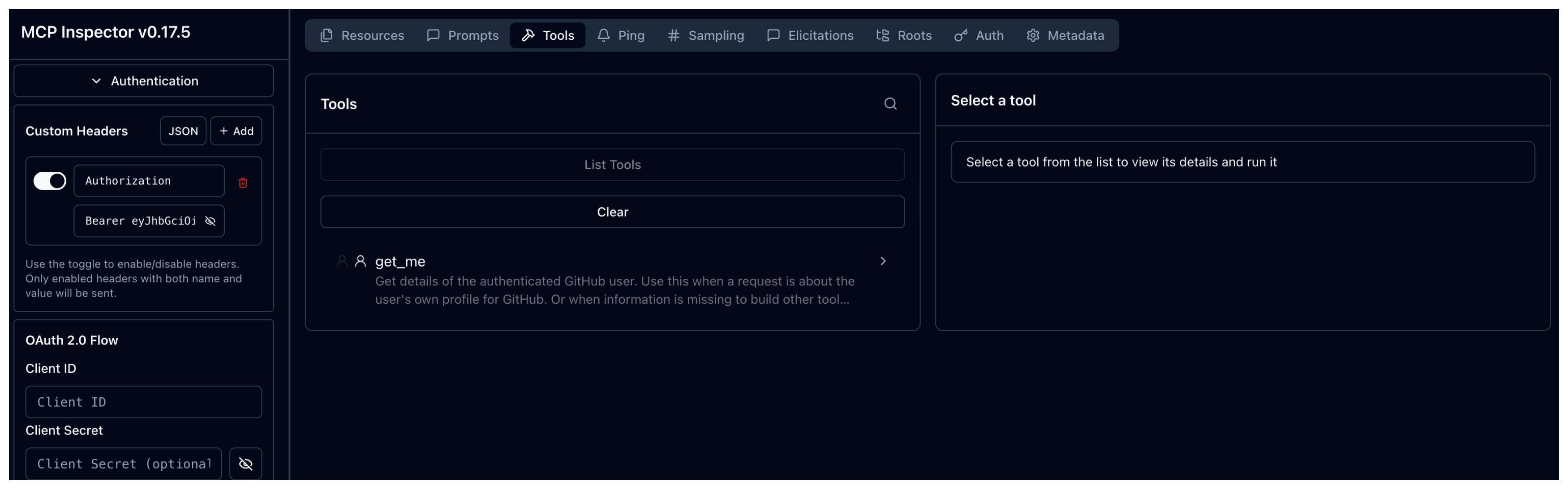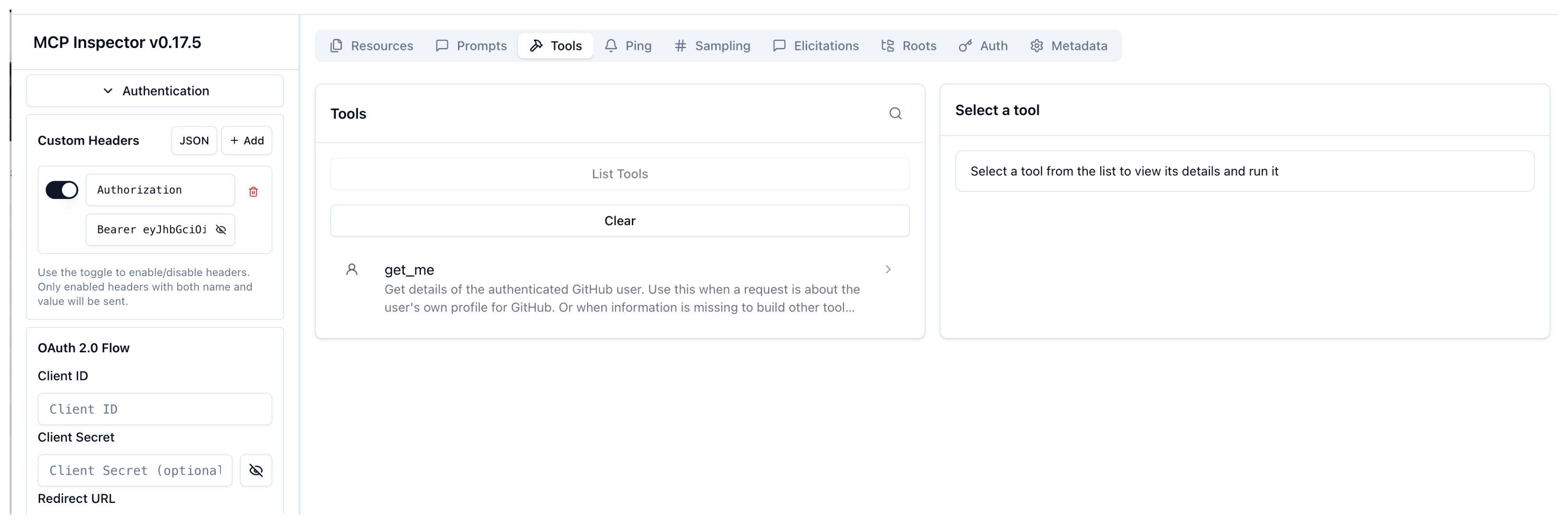 1. Go to the MCP inspector tool, and re-connect with Alice’s token. From the Tools tab, click Clear. Then click List Tools. Verify that you can now only see the get_me tool that you authorized in your AgentgatewayPolicy.