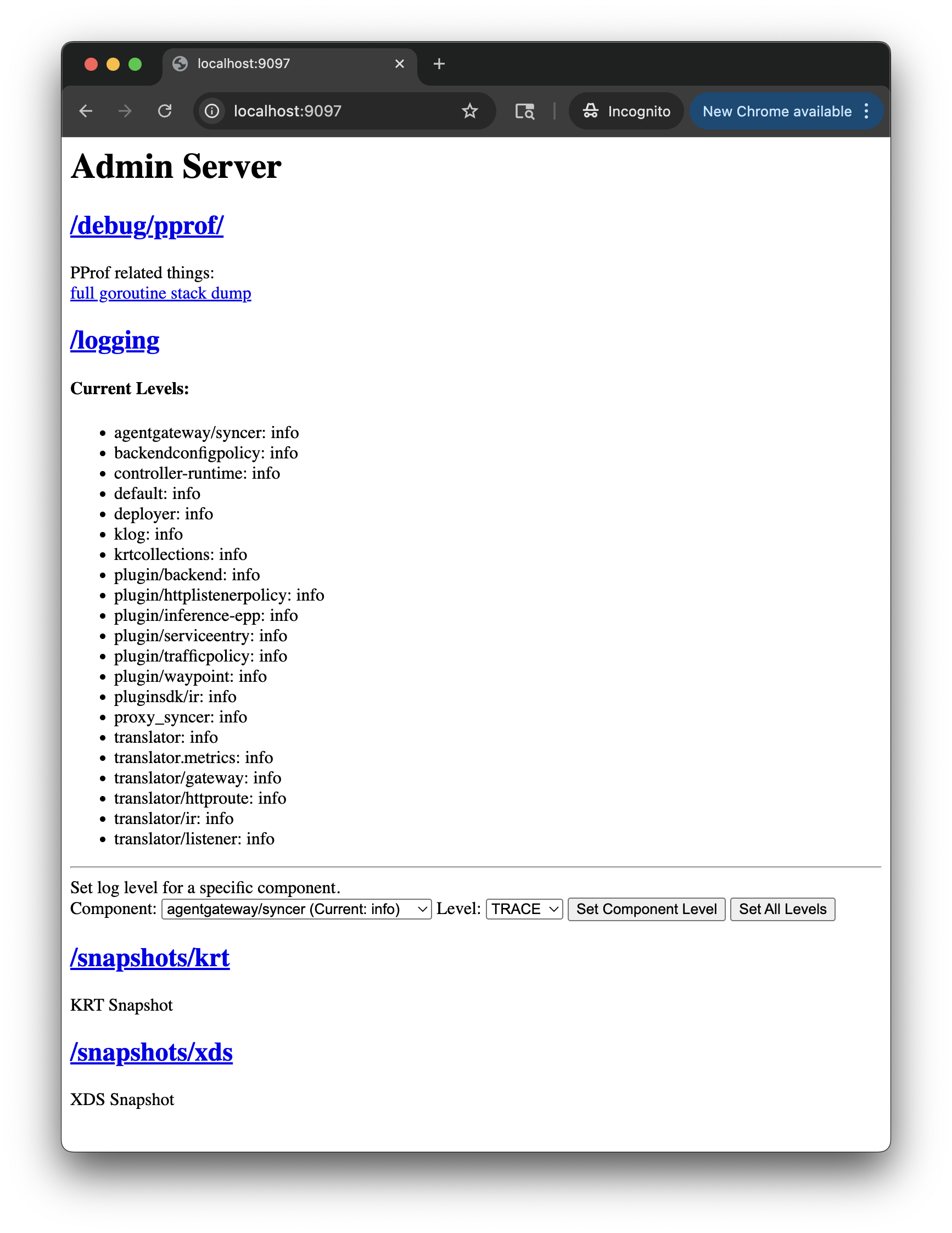 2. In your browser, open the admin server debugging interface: http://localhost:9095/.